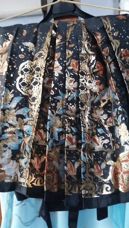 Dieses Mamianqun ist aus hochwertigem schwarzem Brokatsatin gefertigt und zeichnet sich durch eine dreifach verwebte Technik aus: Gold- und Silberfäden bilden subtile Muster wie Sternenlicht auf dem Stoff und sorgen für eine seidig-weiche und dennoch fließende Textur. Es bewahrt den Luxus der traditionellen Webkunst und verbessert gleichzeitig die Knitterfestigkeit durch moderne Textiltechnologie. Der tiefschwarze Grund ist die perfekte Leinwand für Stickereien – jede Bewegung offenbart einen dezenten und doch edlen Satinglanz.