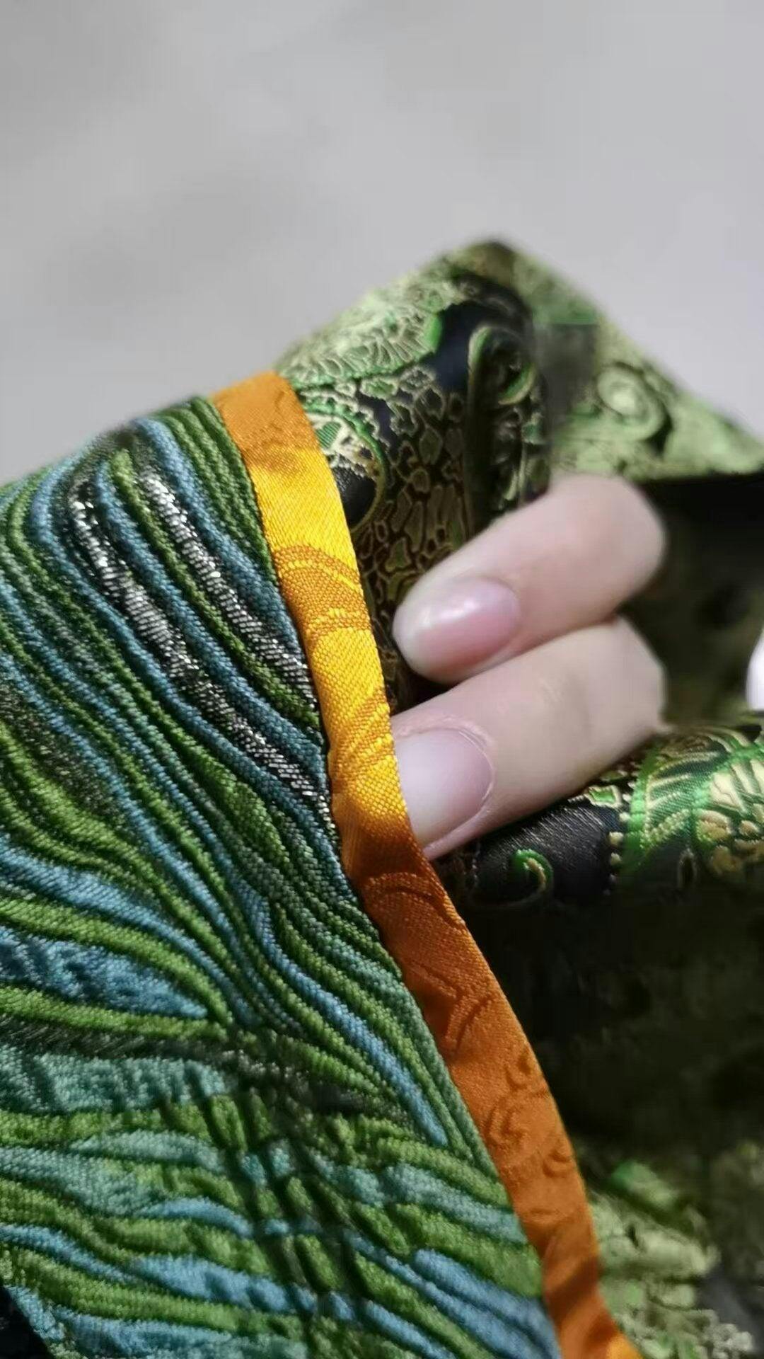 This Qin-Han style Quju robe named "Dian Qi" draws inspiration from cultural relics unearthed from the Mawangdui Han Tombs. Crafted from black damask-like fabric imitating Shu brocade, it adopts an iridescent jacquard technique: the base cloth is a calm black, while the jacquard part is an elegant green. As the viewing angle changes, the presentation of the patterns also varies, exuding an overall air of elegance and luxury. The neckline and cuffs are made by splicing multi-colored fabrics, with distinct layers and exquisite craftsmanship. When matched with the main black fabric, they appear more solemn and antique, as if bearing the weight of history. There are two styles of this Quju robe to choose from: one is the classic Quju robe, and the other is the mermaid-style Quju — it has to be said that both styles are extremely attractive, and wearing them feels like traveling back to the Qin-Han era 2,200 years ago in an instant.